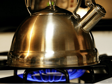 As you run water out of the faucet to fill the kettle, take a moment to calmly listen to the sound the water makes as it runs. Try not to rush the water too quickly like rapids on a river, but instead more calmly like a smooth flowing stream. As you listen to the water flow, you can transport yourself to a quiet and peaceful stream in your mind. Calmly breath in through the nose, bring the energy down to the lower abdomen, imagine it circulating around your kidneys, and passively exhale through your mouth.
